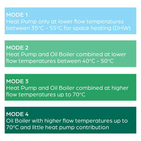 When the outside temperature significantly drops to a point when the heat pump is unable to operate efficiently, the controls system will automatically switch the heating system’s operation to bring in the second heat source, either switching the operation completely from the heat pump to the boiler or using both heat sources together. Such controls are also able to monitor the average external temperatures and optimise the hybrid system’s operation to be most efficient in given conditions, switching between the heat pump, the boiler or a combination of both.